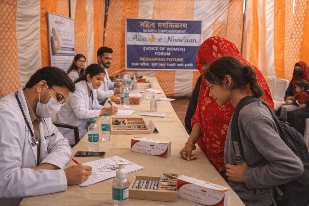Health camp was organized at Shastri Park, Delhi, to raise awareness and provide medical checkups for women, especially those aged 30 to 50, who often neglect their health despite managing their family’s nutrition and wellbeing. The event was conducted by Awaaz Khawateen in collaboration with Yatharth Super Specialty Hospital, Noida, and supported by All India Tanzeem Uma-e-Islam. Over 200 men and women participated, receiving health screenings, consultations, and medications.